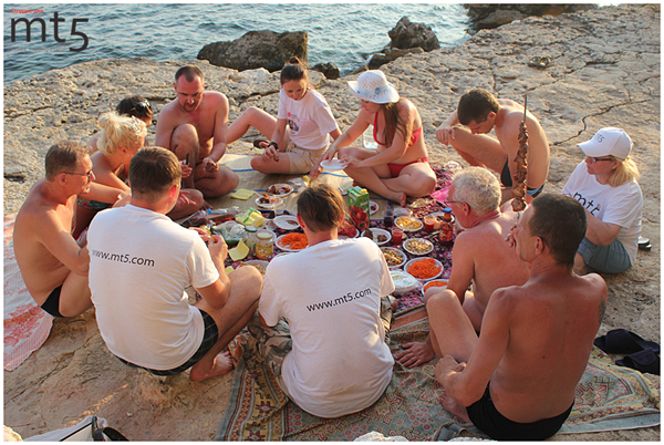 Вооружившись всем необходимым, участники отправились навстречу солнцу, морю, хорошему настроению, конкурсам и подаркам. Первым делом на новом месте закрепили флаги MT5 и InstaForex, затем отправились искупаться в освежающем Черном море, после чего мужчины незамедлительно взялись за приготовление шашлыка. Салаты, изысканные морепродукты и закуски, южные фрукты и овощи и, разумеется, необыкновенно вкусный и сочный шашлык с соусом ткемали посчастливилось отведать участникам этим теплым и душевным вечером. Но это была далеко не вся программа пикника: чуть позже настало время конкурсов и подарков от РуФорума МТ5.