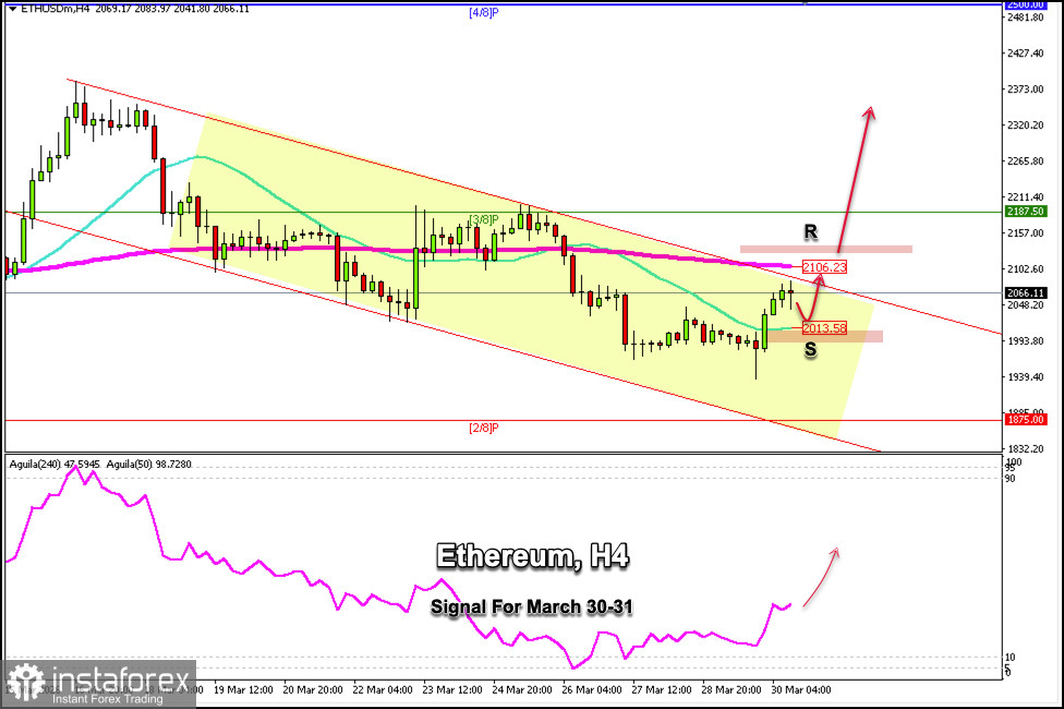 Ethereum (ETH/USD) 現在在約 2,066 美元附近交易,位於 200 EMA 下方,且仍處於自 3 月 15 日以來形成的下降通道之內。如果在接下來幾小時內上行至 2,106 美元區域,Ethereum 可能會面臨強勁阻力。