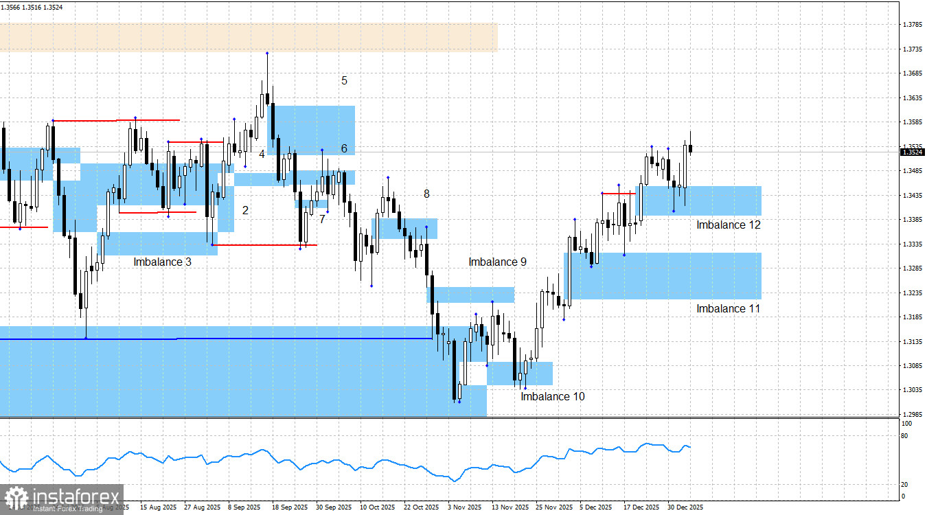目前的技術圖像如下:英鎊的上漲趨勢可以被視為完成,但歐元的上漲趨勢尚未完成。因此,歐元可能會持續將英鎊推升到必要的高度——或反之亦然。多頭已經從看漲失衡 1、看漲失衡 10、看漲失衡 11 中彈升兩次,現在從看漲失衡 12 反彈,這同樣是看漲的。因此,我繼續期望英鎊朝著2025年的高位,即約1.3765水準增長。