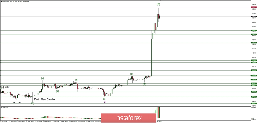 Wave 3 at the BTC/USD market is still in progress and currently, the market is consolidating the gains in the zone between the levels of $4,709 - $5,060. The top for the wave (3)/(c) was made at the level of $5,060 but the longer term technical resistance is still seen at the level of $5,164. The momentum remains strong and positive, but there is an obvious thing: the market conditions are now overbought, so a pull-back might continue for a while here.