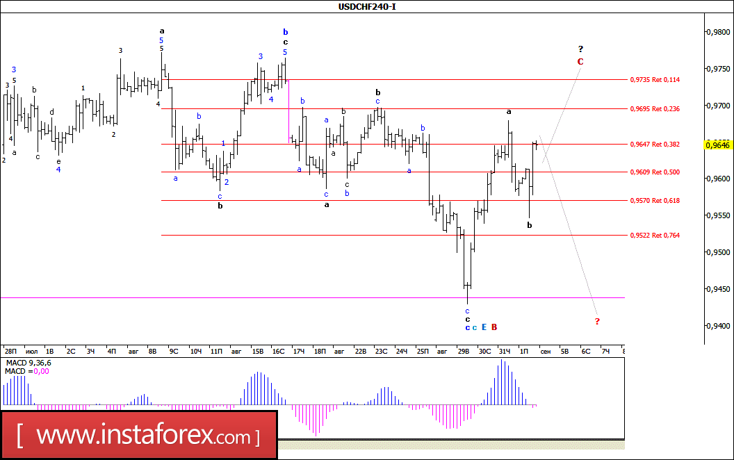 Unable to gain a foothold below 0.9550, in the second half of Friday's trading, the pair USD / CHF rolled back more than 100 pp from the already reached minimum. The wave situation that forms, in this case, allows us to assume that the wave structure of wave c, E, B still took a much more complicated form and subsequent upward movement from the low of August 29, the currency pair attempted to complete the formation of its internal wave with c, c. If this is so and the wave c, c, E, B will not further complicate its wave structure, then the entire growth of quotations from the mark of 0.9430 can be considered as the beginning of the future wave C.