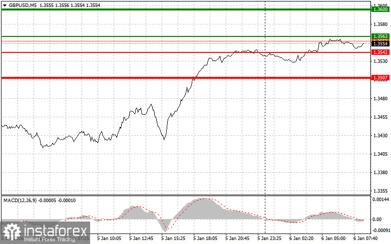 Scénario n° 2 : Je prévois également d'acheter la livre aujourd'hui en cas de deux tests consécutifs du niveau de prix de 1,3542 alors que l'indicateur MACD est en zone de survente. Cela limiterait le potentiel de baisse de la paire et mènerait à un retournement du marché à la hausse. Une croissance vers les niveaux opposés de 1,3563 et 1,3600 est envisageable.