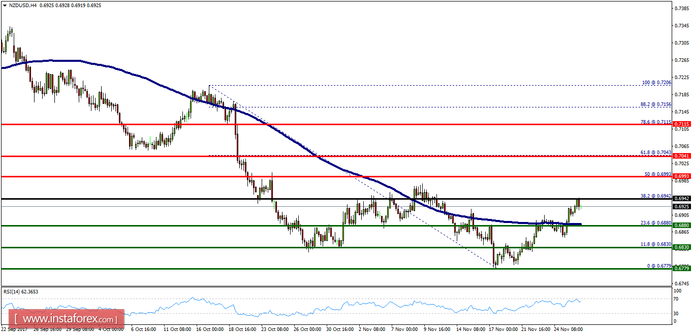 • On the four-hour chart, the NZD/USD pair bullish trend from the support levels of 0.6830 and 0.6880. Currently, the price is in a bullish channel. This is confirmed by the RSI indicator signaling that we are still in a bullish trending market. As the price is still above the moving average (100), immediate support is seen at 0.6880, which coincides with a golden ratio (23.6% of Fibonacci). Consequently, the first support is set at the level of 0.6880. So, the market is likely to show signs of a bullish trend around the spot of 0.6880. In other words, buy orders are recommended above the golden ratio (0.6880) with the first target at the level of 0.6993. Furthermore, if the trend is able to breakout through the first resistance level of 0.6993. We should see the pair climbing towards the next resistance (0.7043) to test it. It would also be wise to consider where to place a stop loss; this should be set below the second support of 0.6830.
