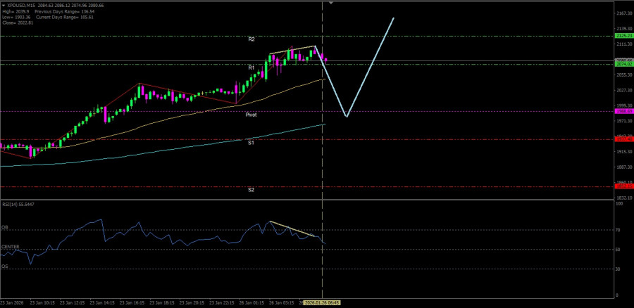 XPD/USDMeski muncul Bearish Divergent antara RSI dengan harga XPD/USD namun dengan kondisi kedua EMA yang masih berpotongan Golden Cross nampaknya masih melanjutkan bias penguatannyaLevel-Level Kunci1. Resistance. 2 : 2125.232. Resistance. 1 : 2074.023. Pivot : 1988.694. Support. 1 : 1937.485. Support. 2 : 1852.15Skenario TaktisZona Reaksi Positif: Jika harga tembus diatas 2074.02 maka ada kemungkinan menguji ke level 2125.23Bias Ekstensi Momentum: Bila 2125.23 berhasil ditembus nampaknya