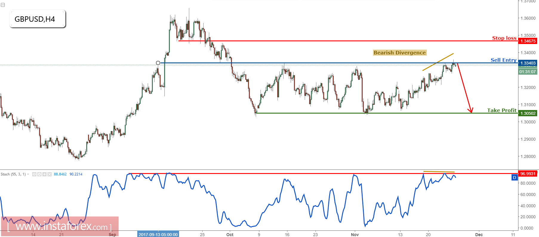 Sell below 1.3340. Stop loss is at 1.3467. Take profit is at 1.3050.