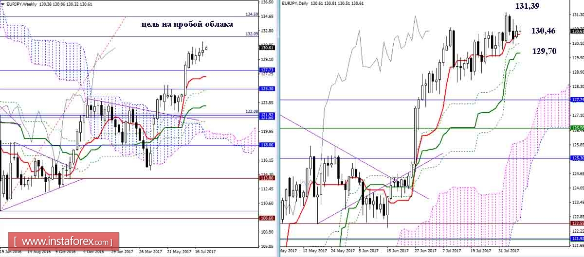Players on the rise will retain their position above the H4 cloud and support the daily short-term trend (130.46). A successful breakout to the resistance of the cross H4 (130.74-90) and exit to a bullish zone is relative to the H1 cloud and will open the way to new upward positions (the goal for the breakdown of the H1 cloud + maximum level of 131.39). Settling below 130.46 and the breakdown of the cloud H4 (Senkou Span B 130.13) will affect the balance of power and form a downside target, allowing the consideration of a decline supporting the upper half (the nearest is 129.70).