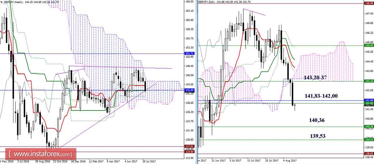 Now the advantages on the side of players on the downside, they continue to develop a downtrend. The goals of junior halves have long been worked out, the benchmarks for decreasing are the levels of older time intervals (140.36 - 139.53). At the moment, the pair is performing a retest of the support levels of 141,83-142,00 that were passed on H4 and N1. The attraction and resistance of this zone is quite strong. Among other resistances of the day, 142.35 (Tenkan N4 + final crossings of the H1 cross) should be noted, but the key zone of resistance today is located above 143.00-20-37 (cloud H1 + final crossings of the cross N4 + high-time levels), so it is hardly relevant.