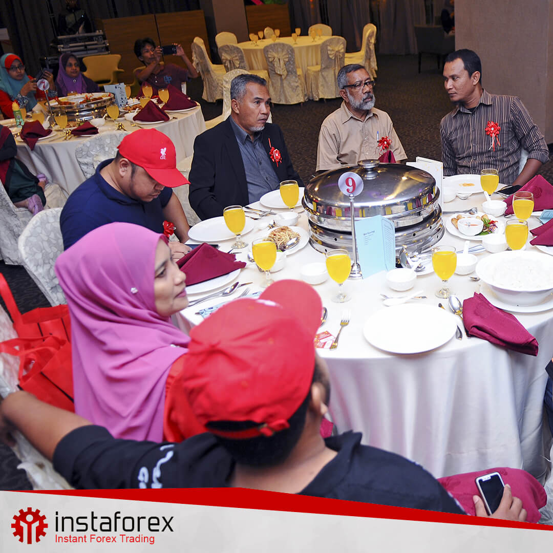 Tetamu untuk Majlis Makan Malam Pedagang Instaforex Kedah menikmati hidangan yang terbaik, dirangkaikan, dan dapat berkongsi idea, berita dan rahsia dalam perdagangan. Semua tetamu dalam acara ini mempunyai minat yang sama — iaitu dalam pasaran pertukaran mata wang asing - supaya mereka mempunyai banyak topik dan cerita untuk dibualkan. Selain itu, para tetamu pada malam itu juga dihargai dengan ucapan Guru forex Muhammad Bin Nordin. Beliau membentangkan kajian menyeluruh tentang analisis teknikal dan berkongsi pengalaman yang terkumpul dan pengetahuannya yang luas, semasa bertahun-tahun kerja dalam bidang kewangan.