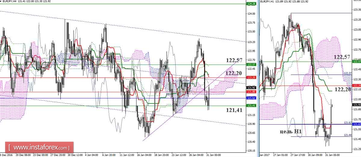 Целая «лестница» поддержек вчера оказалась совершенно бесполезной, значение имела лишь последняя ступень (недельный Тенкан 121,41). Во время снижения пара исполнила пробой облака Н1, после чего спустилась к поддержкам старших таймов (121,41), отработав по дороге нисходящую цель Н1. Преодоление поддержек (во главе с 121,41) открывает перед игроками на понижение новые горизонты. При этом к ориентирам старших таймфреймов можно будет прибавить нисходящую цель на пробой облака Н4.