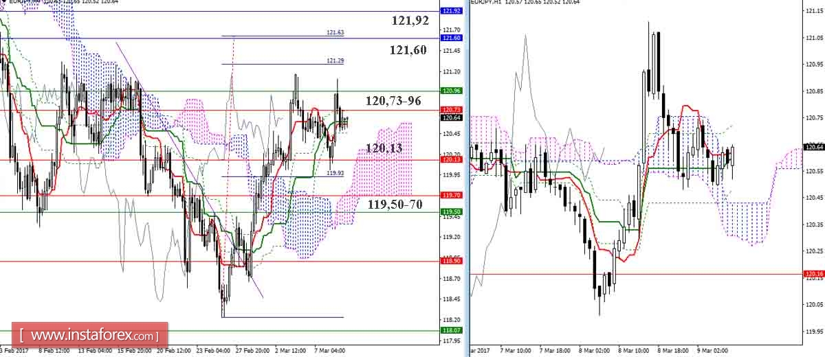 Сопротивления старших таймов (120,73-96) пока сдерживают возможности игроков на повышение, для которых сохраняются ориентиры цели на пробой облака Н4, усиленной месячными уровнями, во главе с месячным Сенкоу Спан Б (121,92). Поддержки сегодня расположены на 120,13 (верхняя граница облака Н4 + дневной Киджун) и 119,50-70 (низ облака Н4 + дневной Тенкан + недельный Фибо Киджун).