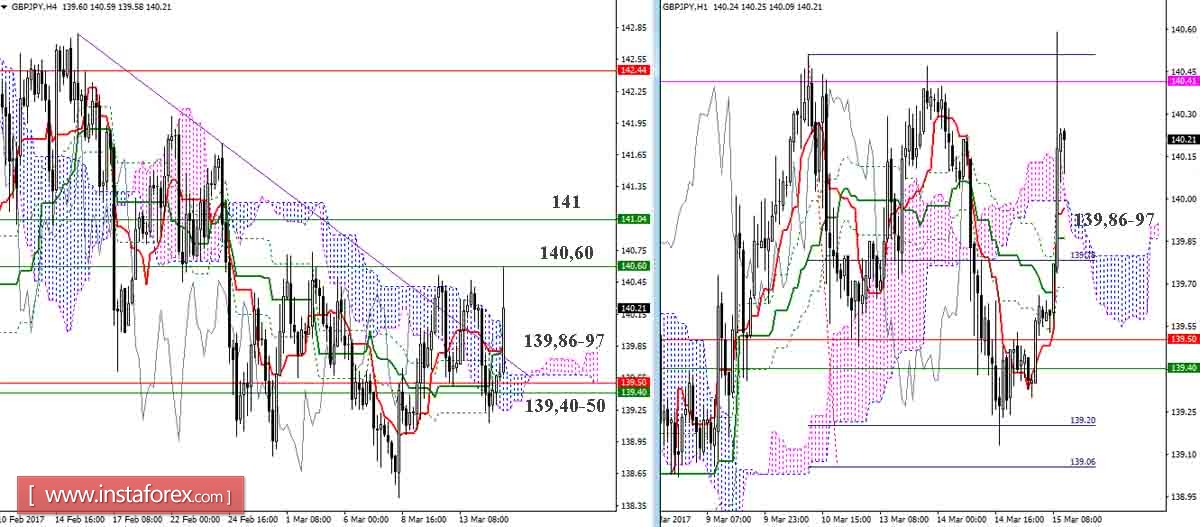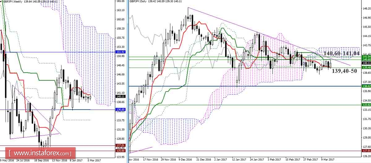 Ключевая зона поддержки (139,40-50) продолжает сохранять своё расположение, кроме этого, сегодня можно отметить промежуточные уровни 139,86-97 (крест Н4 + крест Н1 + облако Н1).