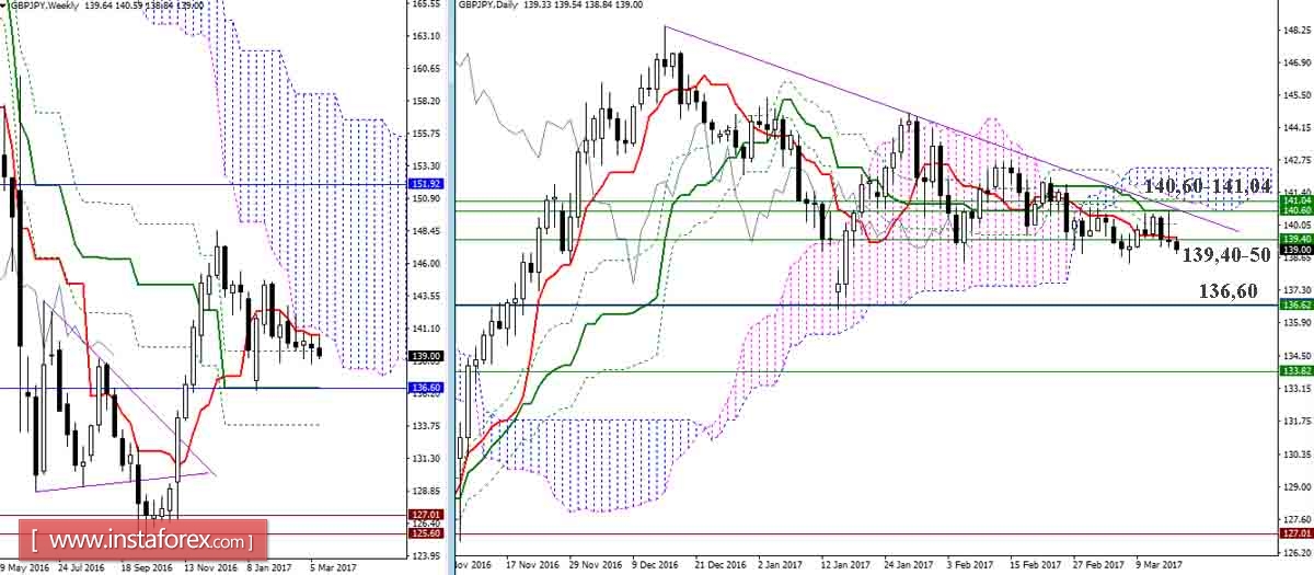 Несмотря на тестирование сопротивлений (140,60), игроки на понижение закрыли прошлые сутки под поддержкой недельного Фибо Киджуна (139,40), тем не менее, пара продолжает оставаться в зоне влияния уровней 139,40-50, а игроки на повышение сохраняют возможности для восстановления своих позиций. Неопределённость и малая результативность движения последних недельных свечей пока сдерживает медведей от развития хорошего направленного движения. Для восстановления дневного нисходящего тренда игрокам на понижение нужно преодолеть минимальный экстремум (138,42), далее можно ожидать снижение к поддержке 136,60 (недельный Киджун + месячный Тенкан).