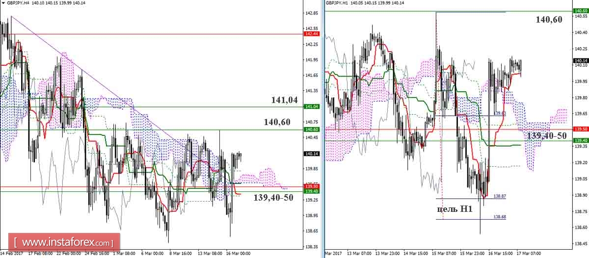 Исполнив понижательную цель на пробой облака Н1, пара приступила к коррекции, которая достаточно быстро обрела трендовую поддержку младших таймфреймов. В настоящий момент сформирована повышательная цель на пробой облака Н1, но основная задача заключается в преодолении сопротивлений 140,60-141,04. Зона поддержек 139,40-50 сегодня сохраняет своё значение и расположение.