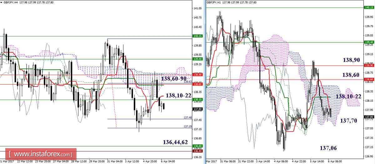 После тестирования ключевой зоны сопротивлений (138,60-90), которая сегодня сохранила своё значение и расположение, игроки на понижение вернули себе краткосрочную поддержку младших таймфреймов 138,10-22 (Тенкан Н4 + Киджун Н1 + уровень старших таймов). В сложившейся ситуации, в случае пробоя облака Н1 (137,70) и обновления минимума (137,06), ориентиром для дальнейшего снижения будет служить цель на пробой облака Н1 и поддержки старших таймов 136,44-62. Изменение сложившегося баланса сил возможно после возврата игроками на повышение района 138,10-22, что, скорее всего, приведёт к новой попытке тестирования, с целью пробоя, облака Н4, усиленного дневным крестом.
