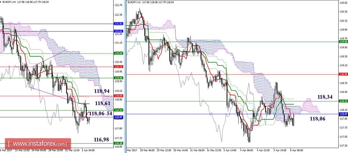 После тестирования сопротивления Киджуна Н4 (118,61), усиленного дневным Тенканом, пара вернулась под уровни 118,06-34. Благодаря расположению под сопротивлениями 118,06-34, медведи сейчас имеют начальное преимущество, которое, в случае выхода из зоны коррекции, позволит им восстановить нисходящий тренд и продолжить снижение.
