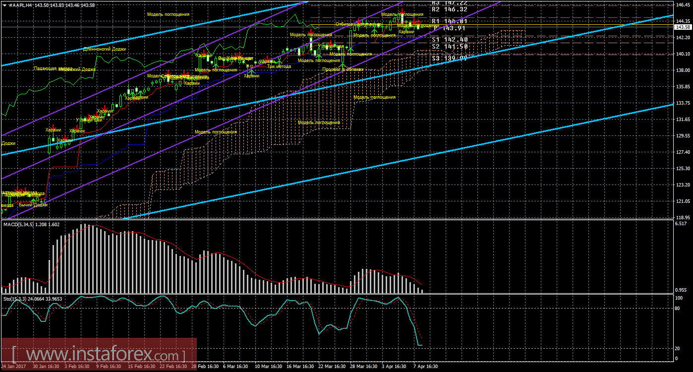 Анализируя акции компании Apple 10 апреля, видим, что цена продолжает корректироваться с целью линия Киджун-сен, но коррекция сейчас больше боковая. Текущий «золотой крест» остается сильным (так как цена располагается выше облака), поэтому длинные позиции индикатор Ишимоку разрешает рассматривать. Оба канала линейной регрессии направлены вверх, поэтому лонги актуальны и по этому признаку. Целью для восходящего движения инструмента является уровень сопротивления 144,81. Следующей целью для движения вверх выступает 146,32. Сформировалось несколько новых свечных моделей, но в условиях минимальной волатильности и откровенно бокового движения они не актуальны. MACD направлен вниз, сигнализируя о коррекционном движении, если индикатор развернется обратно вверх, это укажет на возможное завершение коррекции. Стохастик покинул область перекупленности, что сейчас свидетельствует о нисходящем настроении участников рынка. Отскок цены от критической линии может спровоцировать возобновление восходящего тренда. Младший таймфрейм детализирует картину старшего таймфрейма. На младшем графике видно, что цена продолжает нисходящую коррекцию и закрепилась ниже линии Тенкан-сен. Длинные позиции, таким образом, сейчас остаются актуальными с целями уровни сопротивления 144,81 и 146,32, но после закрепления выше Тенкан-сен.