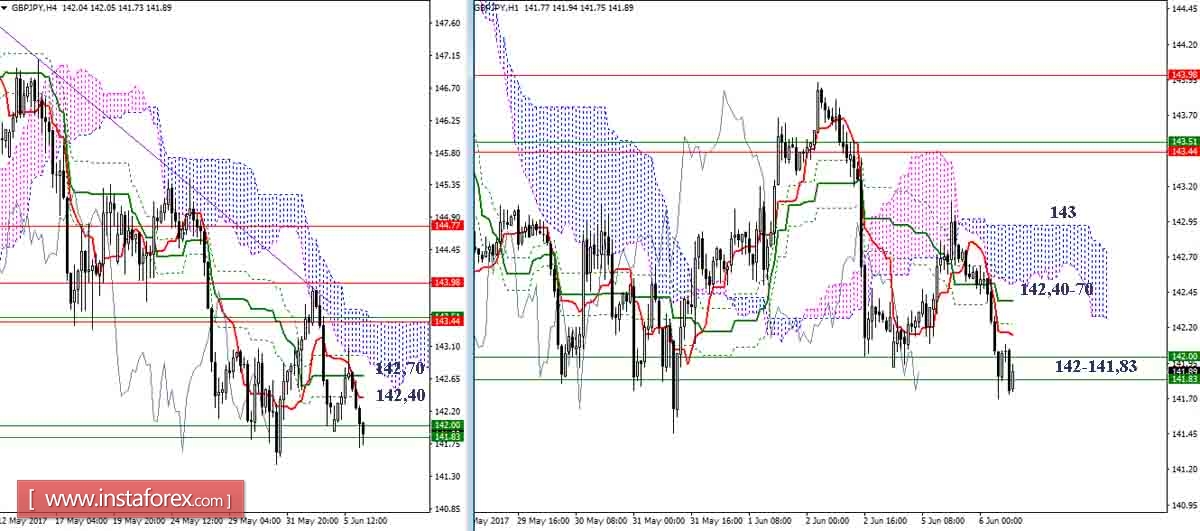 Игрокам на повышение вчера не удалось преодолеть ключевую зону сопротивлений (142,70-90), после которой баланс сил мог измениться. В результате этого медведи вновь тестируют поддержки 142 – 141,83. Преодоление поддержек и закрепление ниже минимального экстремума (141,46) вернёт дневной тренд и откроет новые горизонты для снижения. Среди сопротивлений сегодня можно отметить 142,40 (Тенкан Н4 + Киджун Н1), 142,70 (Киджун Н4 + Сенкоу Спан А Н1) и 143 (Сенкоу Спан Б Н1).