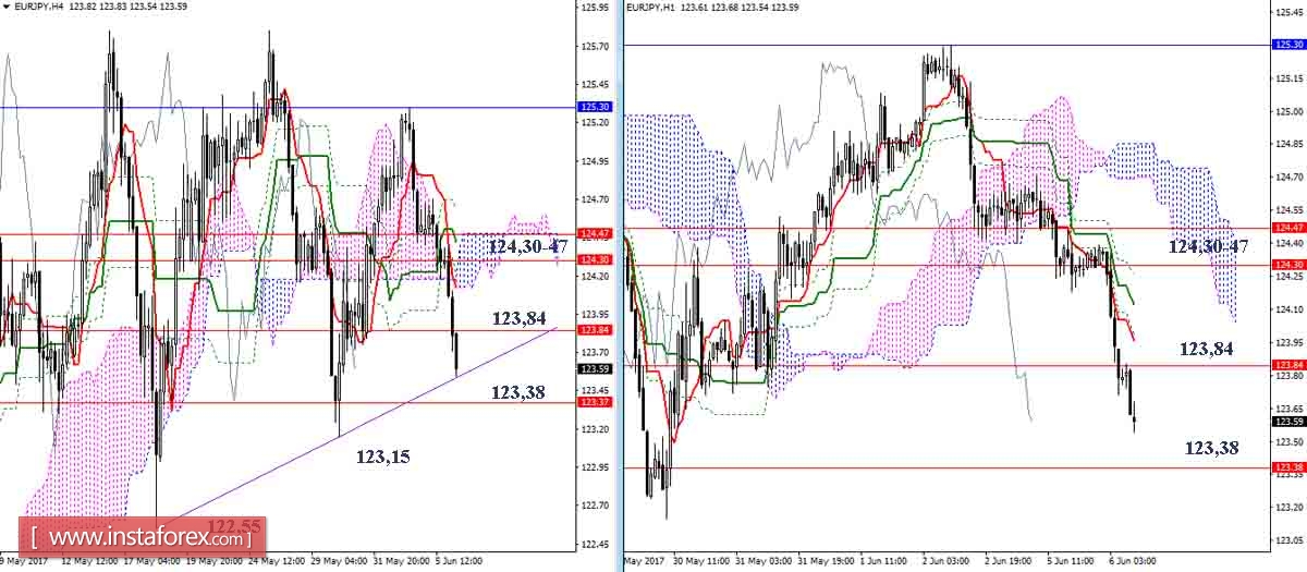 Младшие таймфреймы к настоящему моменту всеми элементами индикатора Ишимоку поддерживают игроков на понижение. Задачи медведей сейчас заключаются в преодолении поддержек и обновлении минимальных экстремумов (123,15 – 122,55). Основными сопротивлениями сегодня являются уровни 123,84 – 124,30 – 124,47.