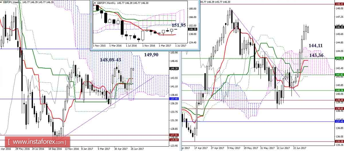 Игрокам на повышение удалось закрыть июнь и прошлую неделю максимально оптимистично. Если быки к настоящему моменту не выдохлись и не истратили на подъём весь свой потенциал, то после закрепления выше максимума закрытия свечей (146,52) можно ожидать отработку дневных целей (цели на пробой облака и на пробой Чинкоу), при этом пара протестирует зону сопротивлений коррекционных экстремумов (148,08-43). Преодоление обозначенных ориентиров откроет дорогу к верхней границе недельного облака (149,90) и к месячному Фибо Киджуну (151,95).
