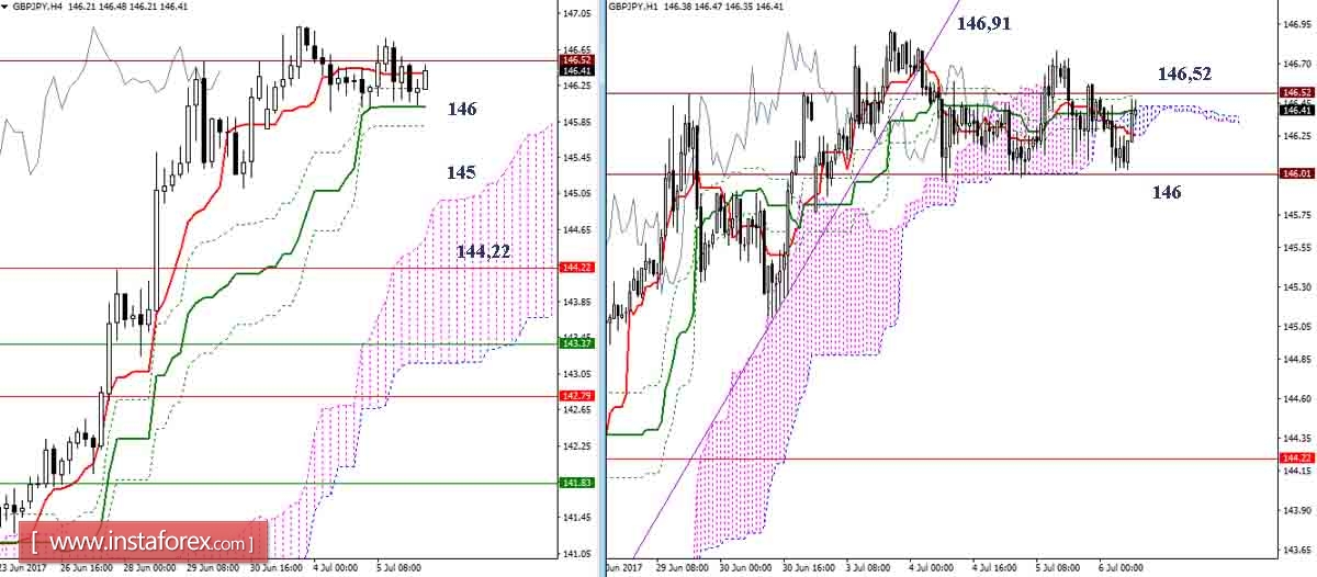 Дневная консолидация способствует появлению на младших таймфреймах бокового движения. Во время которого линии креста Н4 входят в горизонтальное положение, а кресты Н1, не получая реализации, часто сменяют друг друга. Наиболее важными поддержками сегодня являются 146 (Киджун Н4), 145 (верхняя граница облака Н4) и 144,22 (дневной Тенкан). Для игроков на повышение наибольший интерес сейчас представляют максимальные экстремумы прошлой (146,52) и текущей (146,91) недели.