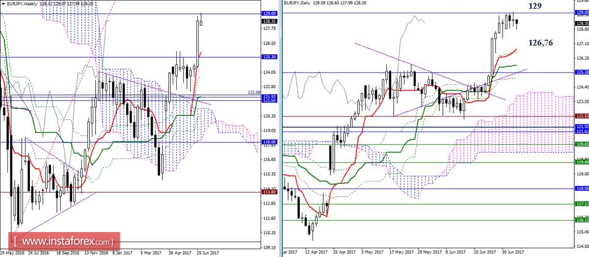 Вчера после очередного тестирования 129, пара вернулась под 128,50 (Тенкан Н4 + облако Н1), передав тем самым начальное преимущество на младших таймах игрокам на понижение, но преодолеть важную поддержку на 128 медведям так и не удалось. Сегодня всё начинается сначала. Возврат на сторону быков 128,50 откроет дорогу к 129, а закрепление под 128 увеличит шансы на развитие коррекционного снижения, ориентирами которого сейчас выступают 127,50 (верхняя граница облака Н4) и 126,76 (дневной Тенкан).