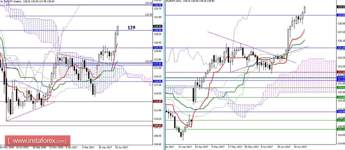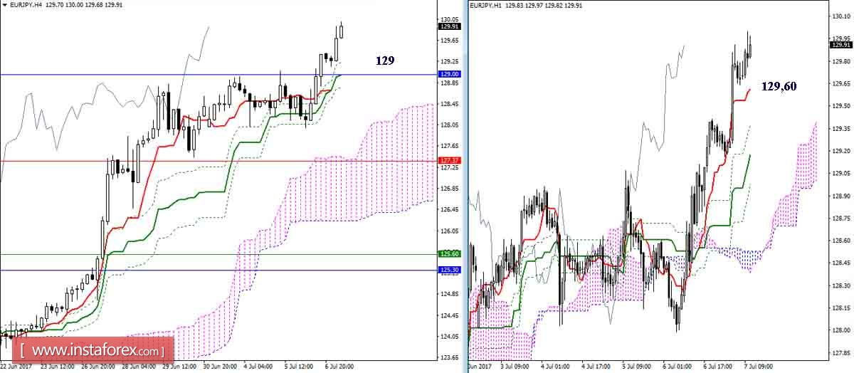 Игроки на понижение так и не дождались развития полноценной коррекции. Соперники продолжили подъём. В сложившейся ситуации основная задача для игроков на повышение заключается в преодолении притяжения месячного Фибо Киджуна (129), это позволит надёжно закрепиться выше и рассмотреть новые повышательные перспективы. Ближайший повышательный ориентир – цель на пробой недельного облака (132,09 – 134,59).