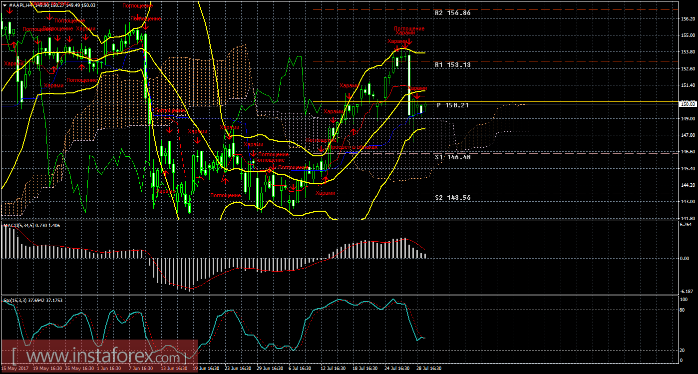 Анализируя акции компании Apple 31 июля, видно, что цена продолжает корректироваться, но ниже критической линии уйти не смогла. Текущий «золотой крест» является сильным (так как цена располагается выше облака), поэтому лонги индикатор Ишимоку делает доступными для открытия. Целью для восходящего движения инструмента является сейчас первый уровень сопротивления 153,13. Следующим таргетом выступает уровень сопротивления 156,86. Новая медвежья модель «Харами» уже потеряла свою актуальность. MACD направлен вниз, что сигнализирует о нисходящем движении цены, его разворот наверх укажет на возможное завершение коррекции. Стохастик покинул область перекупленности, что свидетельствует о нисходящем настроении участников рынка. Полосы Боллинджера по-прежнему направлены вверх и не расширяются, что говорит о восходящем уклоне движения на рынке. На младшем графике видно, что цена еще раз опустилась к линии Киджун-сен, но не смогла закрепиться ниже нее. Таким образом, сейчас являются актуальными длинные позиции с целью уровень сопротивления 153,13, если цена закрепится выше Тенкан-сен. Разворот индикатора MACD вниз укажет на возобновление коррекционного движения.
