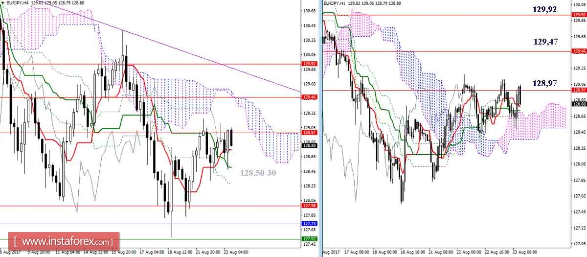 Игроки на повышение, исполняя коррекционный подъём, смогли изменить баланс сил младших таймов, но сейчас ситуация упёрлась в сопротивления более старших таймов (128,97 – 129,47-92). Закрепление выше может изменить предпочтения дневного таймфрейма и потребует новой оценки ситуации. Наиболее важной зоной поддержек сегодня является район 128,50-30 (Киджун Н4 + Фибо Киджун Н4 + Сенкоу Спан Б Н1). Пробой зоны вернёт поддержку индикатора Ишимоку на младших таймах игрокам на понижение и позволит вновь приступить к тестированию уровней 127,97-73-52.