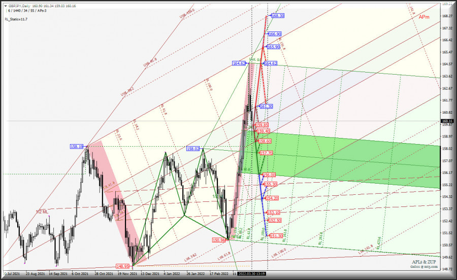 Движение GBP/JPY-Daily с 24 марта 2022 г. продолжит развитие своего движения в зоне равновесия (161.30 - 159.85 - 158.60) вил старшего операционного масштаба Minor-Daily.