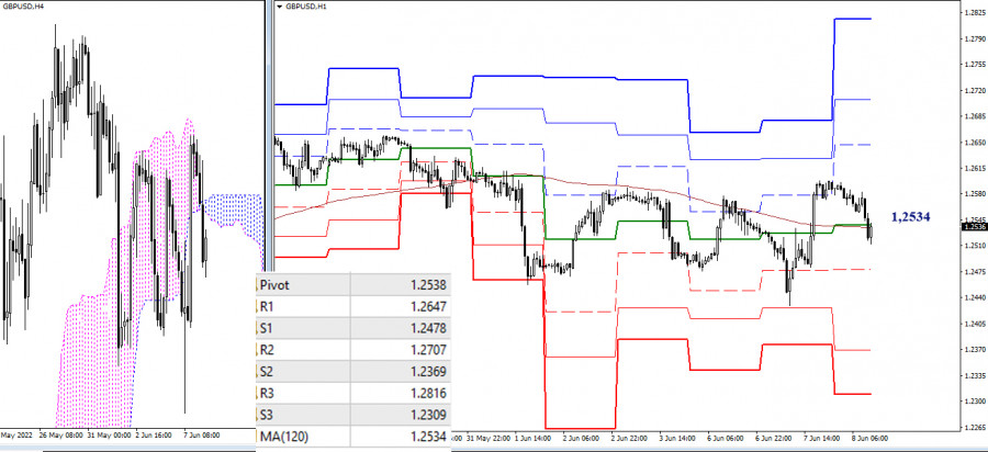 На младших таймах в настоящий момент вновь идёт борьба за ключевые уровни, которые сегодня объединяют свои усилия в районе 1,2534 (центральный Пивот-уровень + недельная долгосрочная тенденция). В результате этого можно отметить, что доминирует неопределённость, а явные предпочтения отсутствуют. При изменении ситуации интересы игроков на понижение внутри дня сегодня могут быть направлены на 1,2478 – 1,2369 – 1,2309 (поддержки классических Пивот-уровней), а ориентирами для игроков на повышение могут стать 1,2647 – 1,2707 – 1,2816 (сопротивления классических Пивот-уровней).