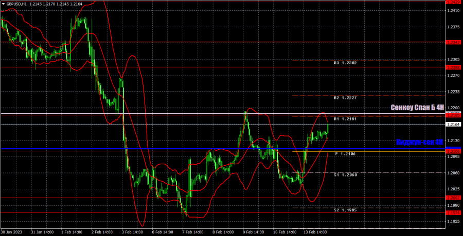 На часовом таймфрейме пара фунт/доллар начала новый виток восходящего движения и движется сейчас к линии Сенкоу Спан Б. Отскок от этой линии очень вероятен, но многое сегодня и завтра будет зависеть от интерпретации рынком отчетов по инфляции в Британии и США. Мы считаем, что вероятность падения британской валюты остается высокой. На 14 февраля мы выделяем следующие важные уровни: 1,1760, 1,1874, 1,1974-1,2007, 1,2106, 1,2185, 1,2288, 1,2342, 1,2429. Линии Сенкоу Спан Б (1,2188) и Киджун-сен (1,2112) также могут быть источниками сигналов. Сигналами могут быть «отскоки» и «преодоления» этих уровней и линий. Уровень Stop Loss рекомендуется выставлять в безубыток при прохождении цены в верном направлении 20 пунктов. Линии индикатора Ишимоку в течение дня могут перемещаться, что следует учитывать при определении торговых сигналов. Также на иллюстрации присутствуют уровни поддержки и сопротивления, которые можно использовать для фиксации прибыли по сделкам. Во вторник в Великобритании уже вышли отчеты по безработице и заработным платам, которые спровоцировали минимальный рост фунта. В Штатах сегодня – «отчет недели» по инфляции. На него реакция должна быть гораздо сильнее.