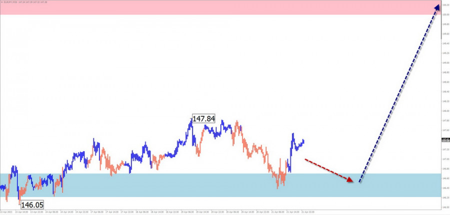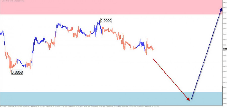 В первой половине предстоящей недели ожидается продолжение общего медвежьего вектора движения пары. После контакта с зоной расчетной поддержки можно рассчитывать разворот и новый всплеск ценового роста. Наибольшую волатильность можно ждать во время выхода новостных блоков.