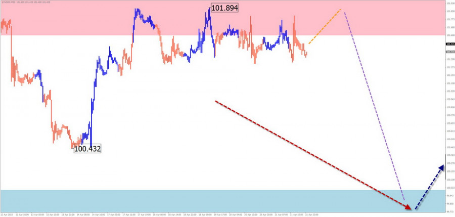 В предстоящей недельный период ожидается продолжение снижения курса индекса, вплоть до границ расчётной поддержки. После контакта с зоной высока вероятность перехода в боковой дрейф, с созданием условий для разворота. Начало роста курса индекса возможно в конце недели.
