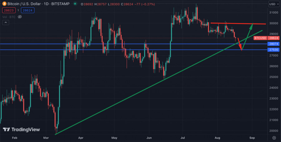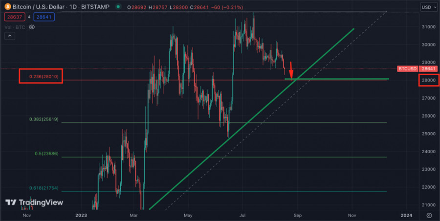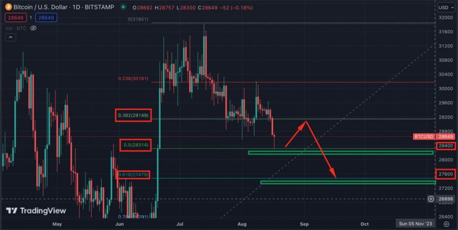 Очевидно, что следующей целью медведей станет попытка совершить пробой и закрепиться ниже уровня $28,5k. В таком случае диапазон колебаний сместится в сторону $27,5k-$28k. Bitcoin находится в рамках крупного восходящего тренда от локального дна на отметке $16k. Если провести линии Фибо от начала импульса до его высшей точки, то окажется, что уровень $28k является глобальным Фибо 0,236 и финальной точкой текущей коррекции.