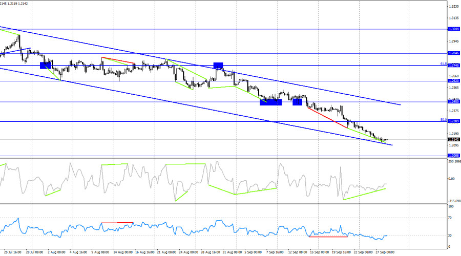 Шестой день подряд формируется волна вниз. Никаких признаков завершения «медвежьего» тренда нет. Никаких признаков завершения текущей волны вниз нет. В лучшем случае они появятся, если сейчас будет образована волна вверх, а следующая волна вниз не пробьет текущий лоу около уровня 1,2112, который еще даже нельзя считать лоу волны. В любом случае эта задача имеет срок выполнение несколько дней, как минимум.