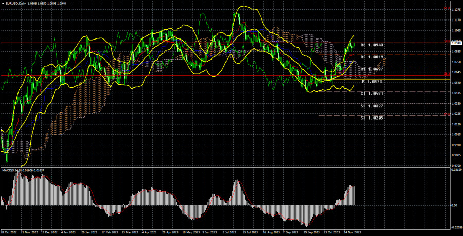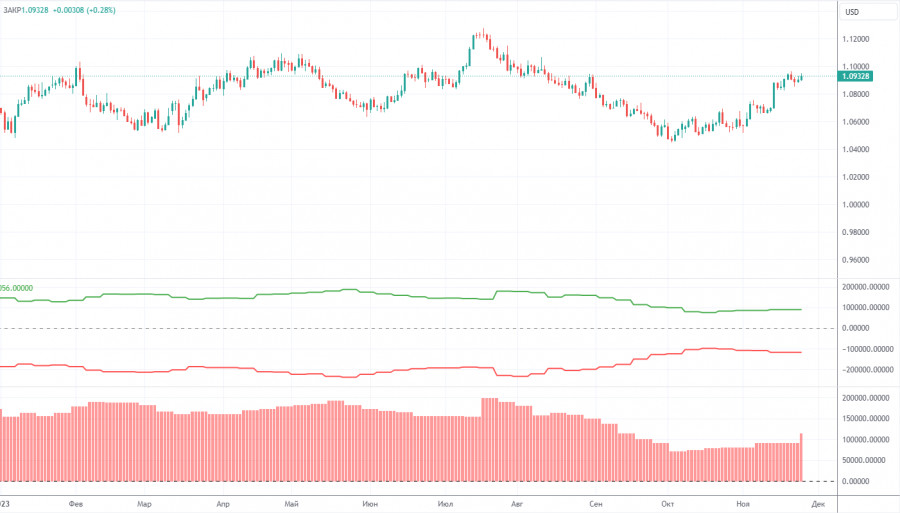 Последний отчет COT датирован 14 ноября. В последние 12 месяцев данные отчетов COT полностью соответствуют происходящему на рынке. Нетто-позиция крупных игроков(второй индикатор) начала расти еще в сентябре 2022 года и примерно в то же время начала расти и европейская валюта. В первом полугодии-2023 нетто-позиция практически не увеличивалась, но евровалюта оставалась в этот период времени достаточно высоко. Лишь в последние несколько месяцев наблюдается падение евро и падение нетто-позиции, которых мы ждали. Однако в последние несколько недель растет и евровалюта и нетто-позиция. Поэтому мы делаем однозначный вывод: пара корректируется вверх и коррекция пока не завершена.