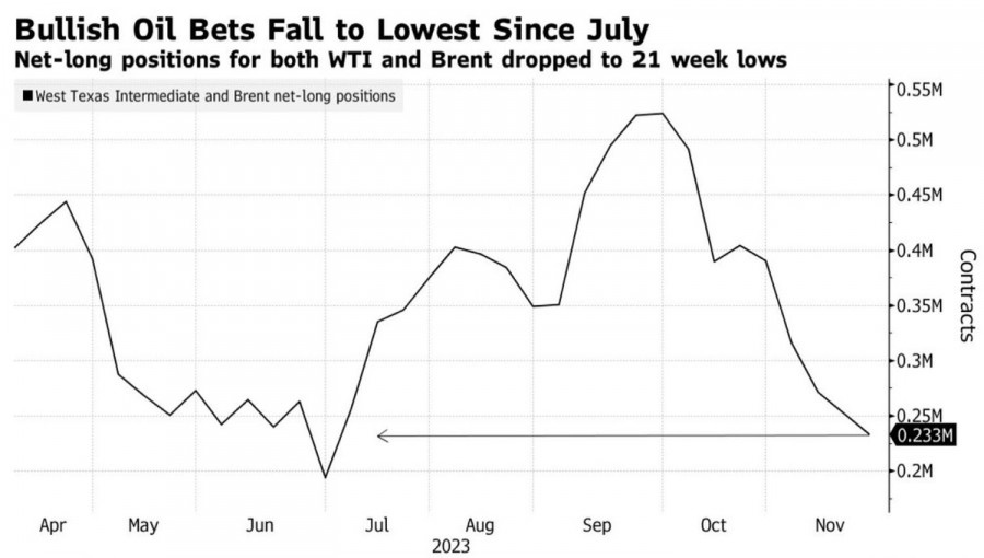 Разительная перемена по сравнению с ожиданиями от саммита 26 ноября, который был перенесен. По слухам, по причине того, что Эр-Рияду нужно было договориться с представителями Африки по поводу сокращения квот. Сейчас четыре источника Reuters сообщают, что ему это удалось. Тогда же ни один из опрошенных экспертов Bloomberg не ожидал от ОПЕК+ новых шагов по снижению добычи. Не думали об этом и хедж-фонды, которые на неделе к 21 ноября снизили валовые шорты по Brent и WTI до минимальной отметки за последние 7 месяцев. Чистые короткие позиции были сокращены до самого дна с конца июня.