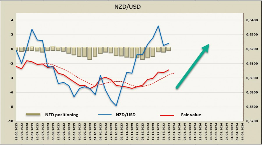 Совокупная спекулятивная позиция по NZD балансирует около нуля, позиционирование нейтральное, медвежий перевес практически ликвидирован и составляет, согласно последнему отчету CFTC, всего 34 млн. Расчетная цена выше долгосрочной средней и направлена вверх.