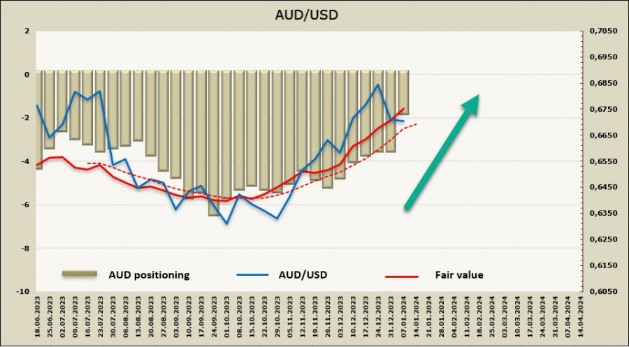 Короткая позиция по AUD продолжает сокращаться, недельное изменение +601 млн, общий медвежий перевес упал до -2,9 млрд, это минимум с февраля 2023 г. Расчетная цена уверенно растет.