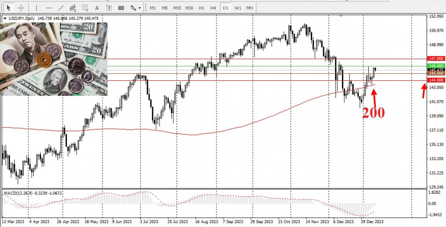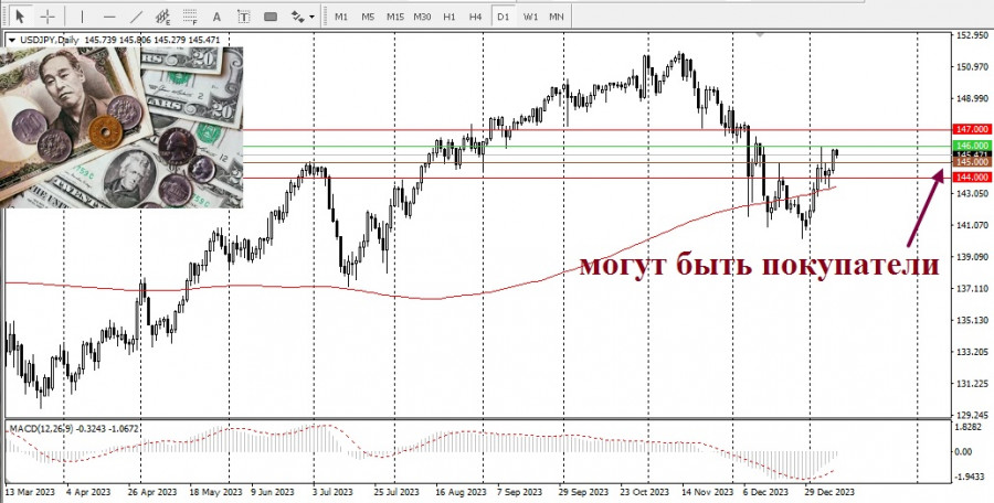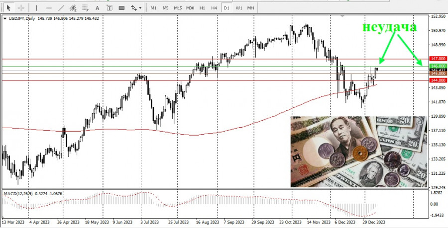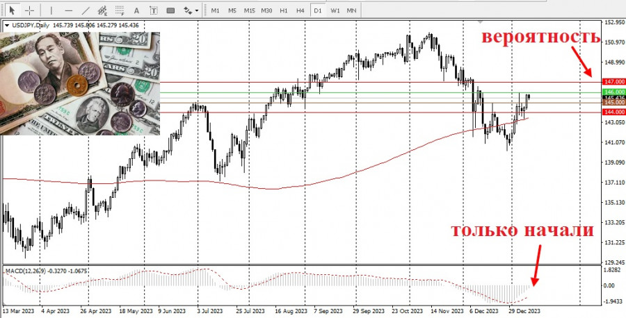 А с учётом того, что на дневном графике осцилляторы только начали набирать положительную динамику, пара USD/JPY может подняться до барьера 146,55-146,60. А импульс предполагает рост до уровня 147,00 и выше.