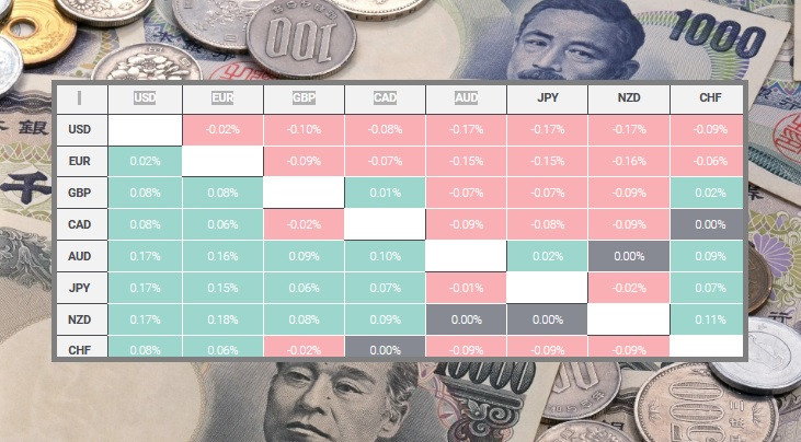 В таблице ниже показано процентное изменение японской иены по отношению к основным валютам, перечисленным на сегодняшний день.