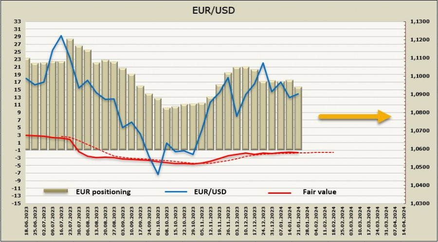 Поскольку новых данных после декабрьского заседания было мало, вероятнее всего, что январское заседание пройдет без неожиданностей с точки зрения длительного влияния на рынок. Пока прогнозы по ФРС и ЕЦБ предполагают первое снижение ставки ФРС в марте, а ЕЦБ – в июне, то это создает условия для роста EUR/USD в 1 квартале. Если же прогнозы поменяются, а именно это и происходит в последние дни, то движущая сила, толкающая евро вверх, сократится или вовсе исчезнет.