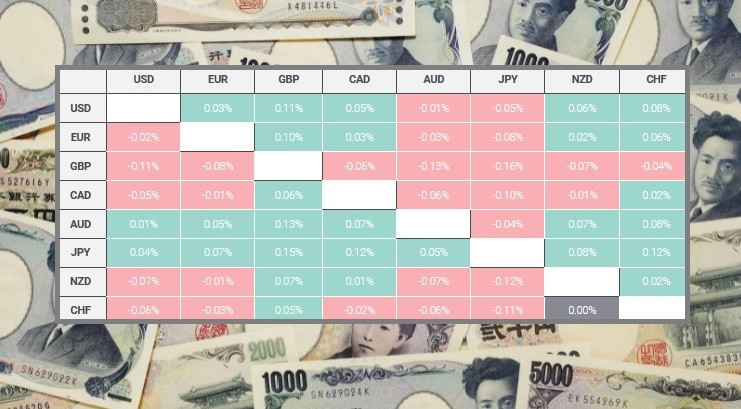 В таблице ниже показано процентное изменение японской иены по отношению к основным валютам, перечисленным на сегодняшний день.