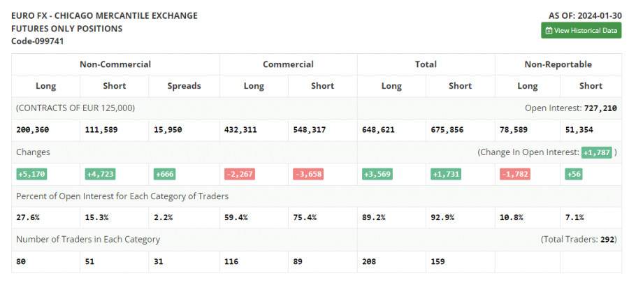 Прежде чем говорить о дальнейших перспективах движения EUR/USD, давайте посмотрим, что происходило на фьючерсном рынке и как изменились позиции Commitment of Traders. В COT-отчете (Commitment of Traders) за 30 января наблюдался рост длинных и коротких позиций. Очевидно, что после заседания Федеральной резервной системы стало понятно, что никто пока ничего менять не собирается, а последние данные по ВВП и рынку труда США и вовсе указывают на то, что ставки нужно держать высокими как можно дольше, так как снизив их сейчас, можно нарваться на очередной всплеск инфляционного давления, с которым Центральный банк борется уже почти два года. Эта неделя обещает быть довольно спокойной в плане статистики, так что можно рассчитывать на сохранение медвежьего тренда по евро и укрепление американского доллара. В COT-отчете указано, что длинные некоммерческие позиции выросли на 5 170, до уровня 200 360, в то время как короткие некоммерческие позиции выросли на 4 723, до уровня 111 589. В результате спрэд между длинными и короткими позициями вырос на 666.