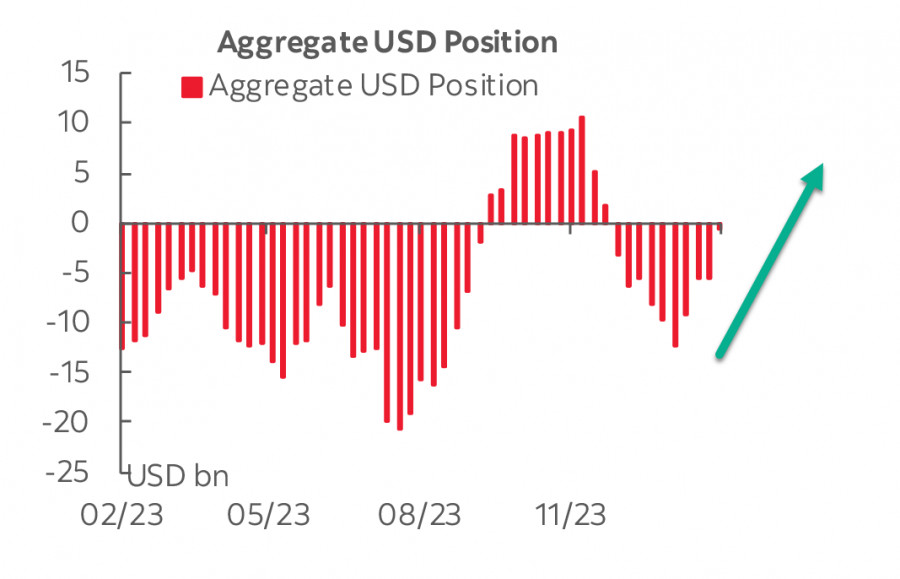 Короткая позиция по доллару США, как следует из отчета CFTC, практически ликвидирована. Недельное изменение против основных валют +5,124 млрд, от накопленной к началу января короткой позиции в 12.2 млрд осталось всего 494 млн, позиционирование нейтральное, но динамика явно в пользу продолжения покупок USD.
