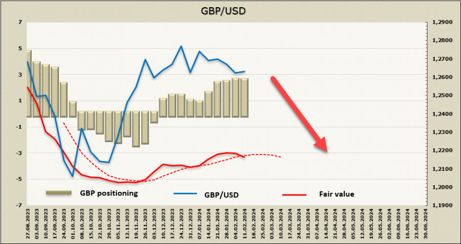 Фунт добавил к совокупной длинной позиции всего 4 млн., общий перевес +2,714 млрд. Позиционирование бычье, однако расчетная цена уходит ниже долгосрочной средней, что может указывать на угрозу дальнейшего снижения.