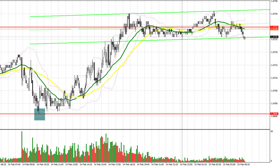 Вчера был образован лишь один сигнал по входу в рынок. Давайте с вами посмотрим на 5-минутный график и разберемся с тем, что там произошло. В своем утреннем прогнозе я обращал внимание на уровень 1.0696 и планировал от него принимать решения по входу в рынок. Снижение и формирование ложного пробоя в районе 1.0696 позволили получить сигнал на покупку, что вылилось в рост пары на 30 пунктов. Во второй половине дня подходящих точек входа в рынок я так и не дождался.