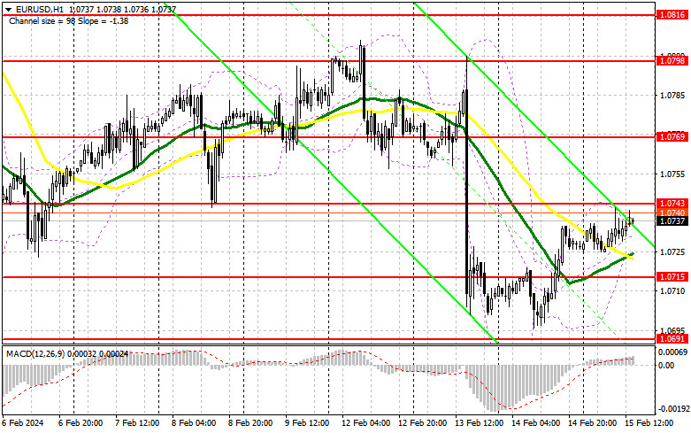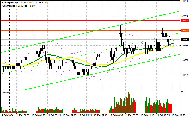 В своем утреннем прогнозе я обращал внимание на уровень 1.0743 и планировал от него принимать решения по входу в рынок. Давайте посмотрим на 5-минутный график и разберемся с тем, что там произошло. Рост произошел, но до ложного пробоя дело так и не дошло. Из-за низкой волатильности рынка торговля сохранилась в рамках канала. Учитывая, что ни один из уровней протестирован не был, нет смысла что-то менять. На вторую половину дня техническая картина не пересматривалась.