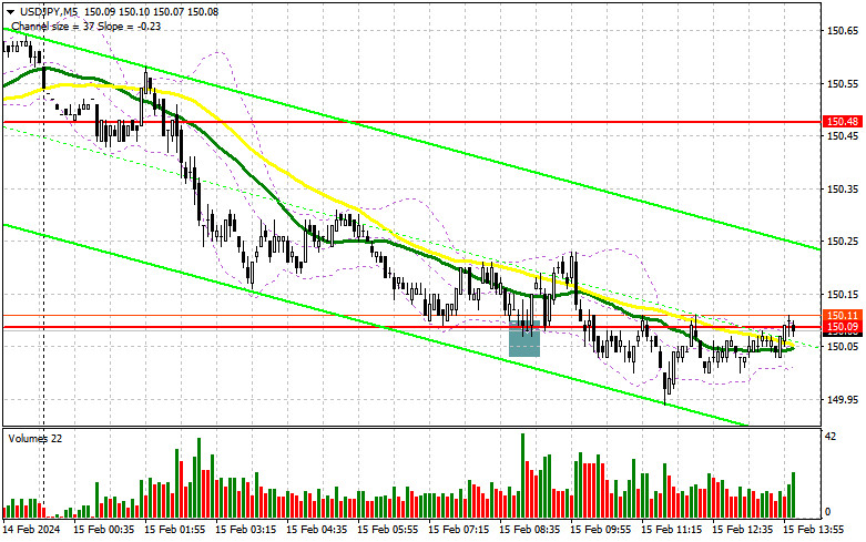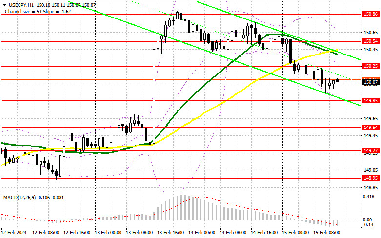 Продавцы продолжают выстраивать довольно неплохую коррекцию, но говорить о переломе восходящего тренда пока еще очень рано. В случае очередного роста пары после выхода данных по США медведям необходимо сосредоточиться и действовать в районе 150.25 – нового сопротивления, образованного по итогам сегодняшнего дня. Ложный пробой на этом уровне даст хорошую точку входа на продажу с движением к поддержке 149.85, где проходят средние скользящие, играющие на стороне покупателей. Прорыв и обратный тест снизу вверх этого диапазона нанесут более серьезный удар по позициям быков, что приведет к сносу стоп-приказов и откроет путь к 149.54, что будет значительным успехом для продавцов. Более дальней целью выступит область 149.27, где буду фиксировать прибыль. При варианте роста USD/JPY и отсутствия активности медведей на 150.25 во второй половине дня развитие бычьего тренда продолжится. Поэтому лучше всего отложить продажи до теста следующего сопротивления 150.54. При отсутствии движения вниз и там я буду продавать USD/JPY сразу на отскок сразу от 150.86, но лишь в расчете на коррекцию пары вниз на 30-35 пунктов внутри дня.