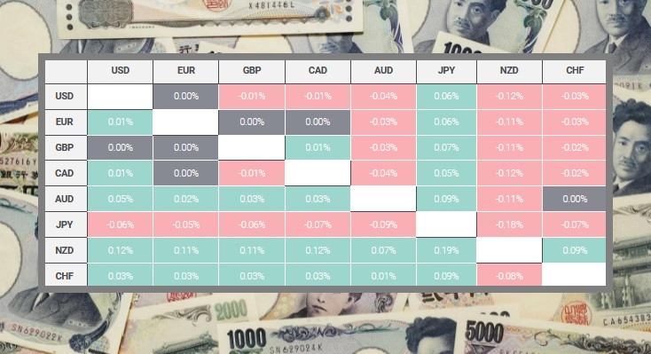 В таблице ниже показано процентное изменение японской иены по отношению к основным валютам, перечисленным на сегодняшний день.